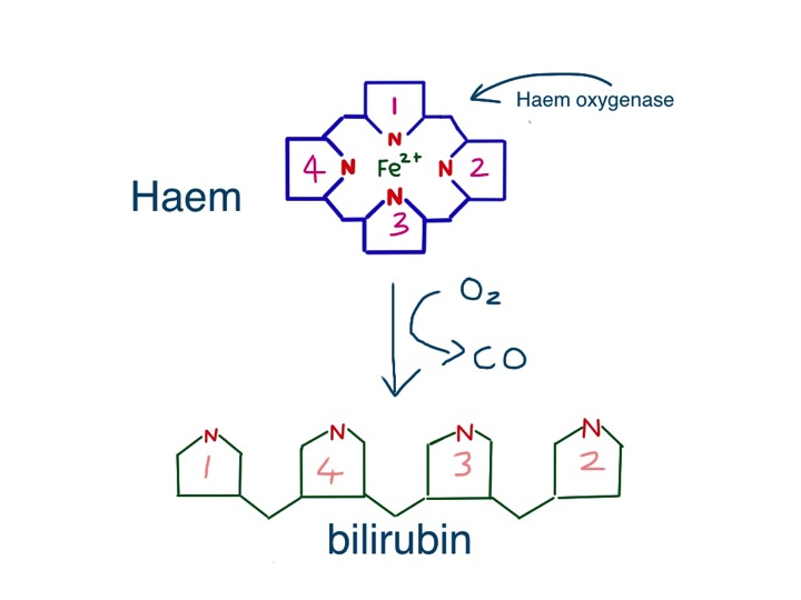 haem is broken down by the enzyme haem oxygenase to form bilirubin