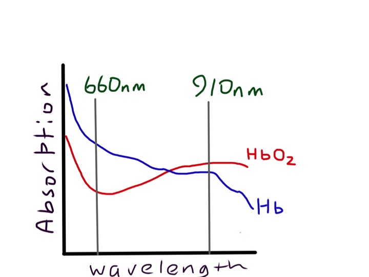 First it is worth thinking what the lungs are for. They do two main things: 1) get oxygen into our bloodstream from the air and 2) remove carbon dioxide from our blood so we can breathe it out. What happens when these vital functions don’t work properly? Normally our lungs are very good at getting oxygen into our bloodstream. Blood coming out of our lungs into the pulmonary vein and then into our main systemic arteries is usually saturated to 98%. We can measure this easily with a pulse oximeter. This is a wonderful device which has revolutionised our management of patients with respiratory conditions. It was invented in 1972 by Japanese engineers called Takuo Aoyagi and Michio Kishi. The way it works is that it shines two beams of light through the finger tip or earlobe. One beam is red light at wavelength about 610nm, the other is in the near infra-red at 910nm.
