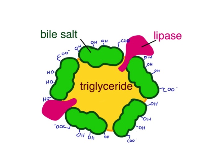 Bile salts are detergents. Just like washing-up liquid, they emulsify fats, breaking large fat globules into smaller micelles which do not stick to each other, or anything else. Cholesterol is essentially very insoluble in water, or hydrophobic. When an organic acid group is added – to make bile salts – it gains a hydrophilic or water-attracting group. This is just like soap – a long lipid chain with an organic acid group at the end. The hydrophobic lipid part is embedded in the tiny fat globule and the hydrophilic groups stick outside in the watery medium of the intestinal contents.