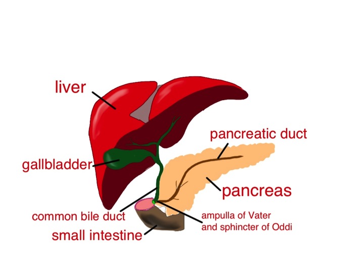 bile is made in the liver – it is stored in the gallbladder and squirted into the small intestine after a fatty meal, along with pancreatic secretions – Sylvia’s gallstone was impacted in the sphincter of Oddi