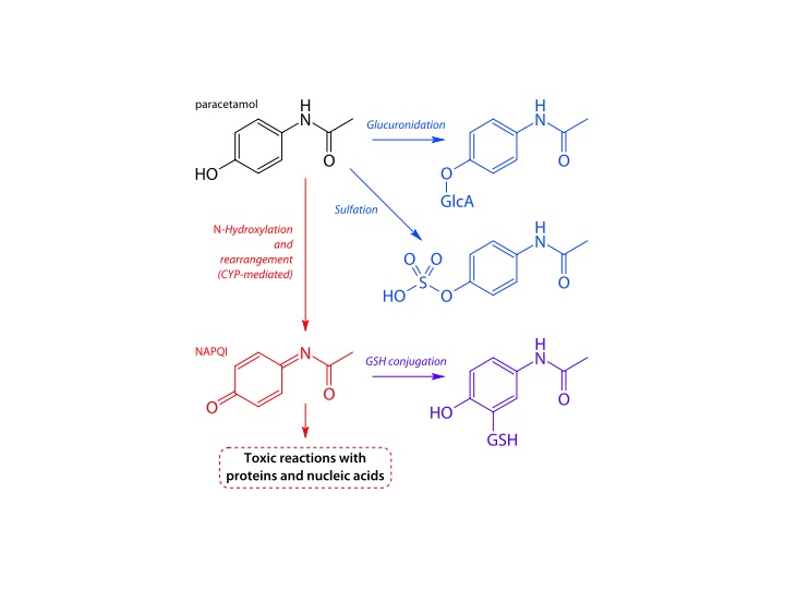 Paracetamol is metabolised by our liver. Normally, about 90% is conjugated with glucuronic acid or sulphate. Glucuronic acid is like glucose, with an extra COOH attached.