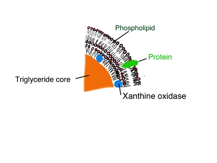 cartoon of a section of a milk globule showing three layers of phospholipid membrane, surface proteins and xanthine oxidase