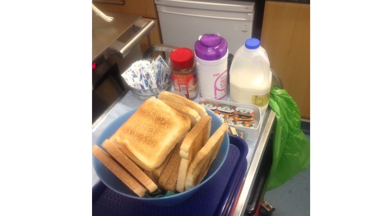 Sometimes I notice when coming onto the assessment unit there is a smell which is a combination of stale urine/bowel gas and air freshener. But when I started at 8 this morning everything is overpowered by the wonderful scent of fresh toast. The domestics are pushing trolleys on which is piled not only toast, but also cornflakes and porridge (that’s oatmeal for US readers), jam and cups of tea.