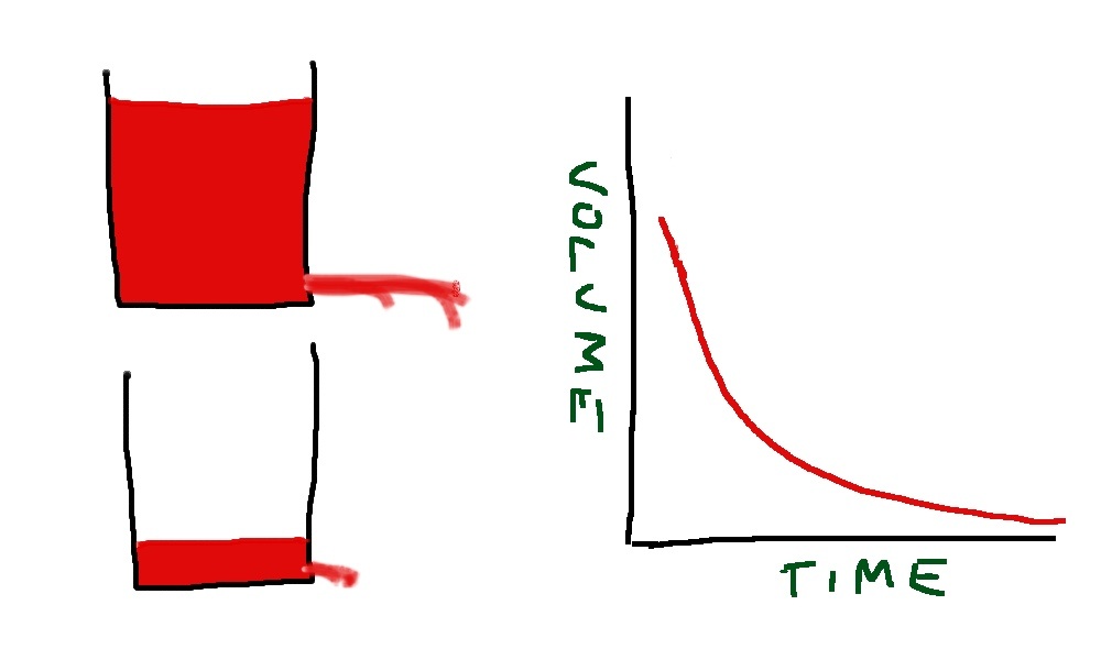 Have you ever noticed the guy asleep on the floor at the end of the party who has drunk so much that he can’t get himself home? Next time look at his breathing pattern – he will have slightly rapid, deep, and sighing respiration. This is known as Kussmaul breathing and is due to the large amounts of acetic acid being produced from the alcohol he has inadvisedly drunk. (Although I note that the person who has written the Wikipedia article on Kussmaul’s respiration says that this term only applies to those patients about to die from acidosis – not how it is used in most medical wards – perhaps a bit of a pedant?). If the alcohol was being metabolised by a first-order hole-in-the-bucket process he would not survive.