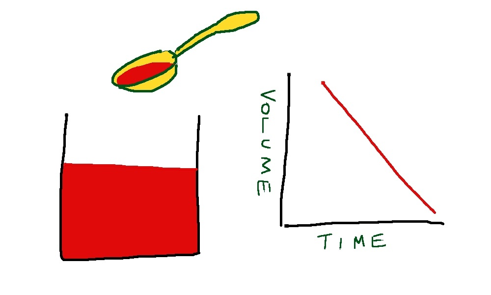 Ethanol is not metabolised by first-order metabolism, but by zero-order metabolism. The bucket analogy now is to think of someone with a ladle who scoops out a measure of water from the bucket every 10 seconds. The rate at which the bucket empties now is not dependent on the amount in the bucket, but on the size of the ladle. This is a safe way to metabolise ethanol because it limits the amount of ethanal and ethanoic acid which can accumulate – not enough to do serious damage.