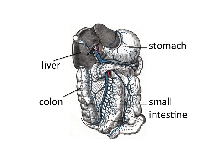 all the blood coming from the stomach and small and large intestine goes into the portal venous system and through the liver to be processed – including removal of ammonia and small amines – from Grays anatomy 1918