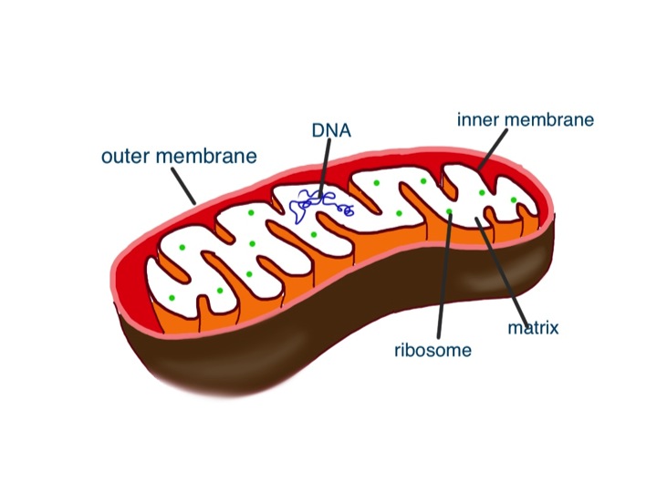 mitochondrion – it has all the stuff inside that a bacterium has, but without a tough cell wall – redrawn from wikipedia – author kevinsong
