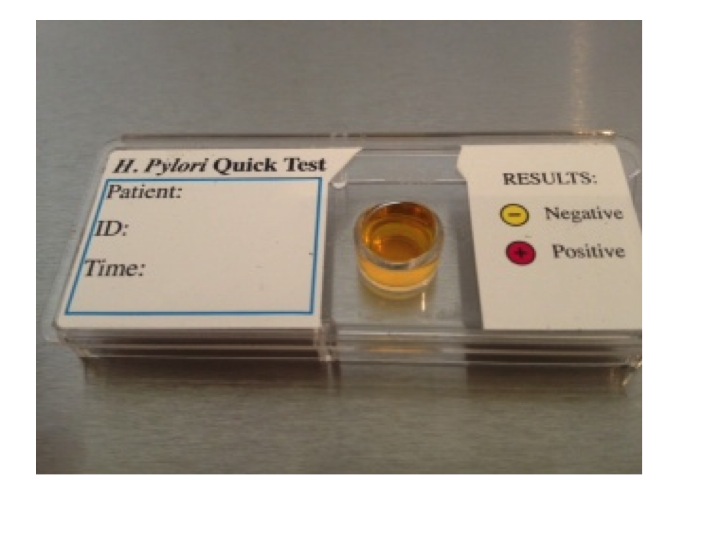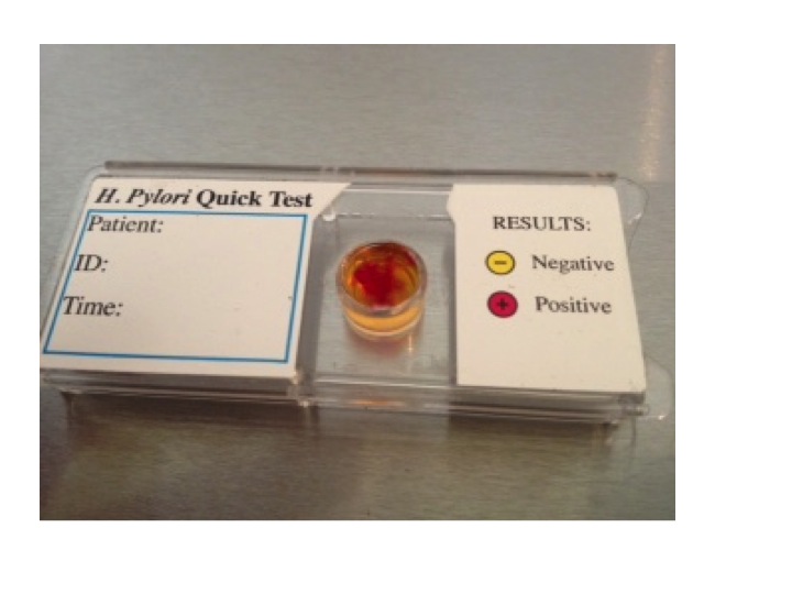 So he was filled up with a blood transfusion, vitamins (see vodka blog below) and given terlipressin – a drug which constricts oesophageal varices and helps to stop bleeding. He was sent as an emergency to have an upper gastrointestinal endoscopy. In fact he did not have significant varices. He had a bleeding duodenal ulcer. The ulcer was cauterised and injected with adrenaline, a biopsy was taken from his duodenum, and he was sent to the admissions unit.  Part of the duodenal biopsy was put into a CLO test kit.