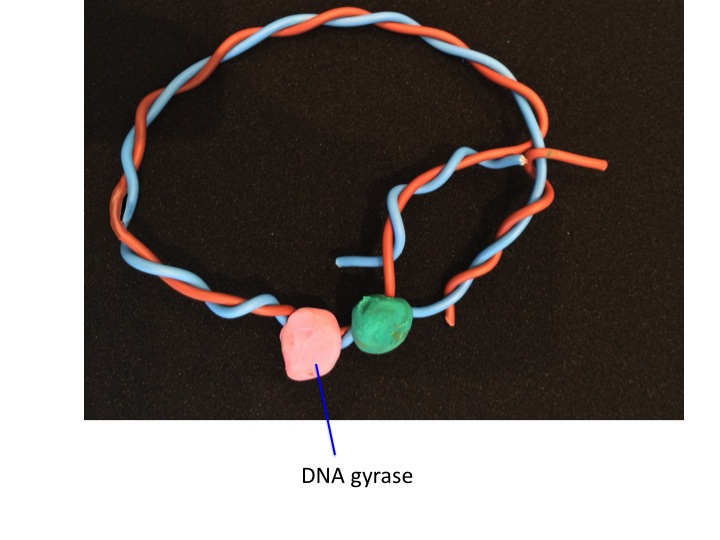 DNA gyrase sorts out this problem – cutting the DNA strand and rejoining it having removed the twist – fluoroquinolones such as ciprofloxacin stop this enzyme working