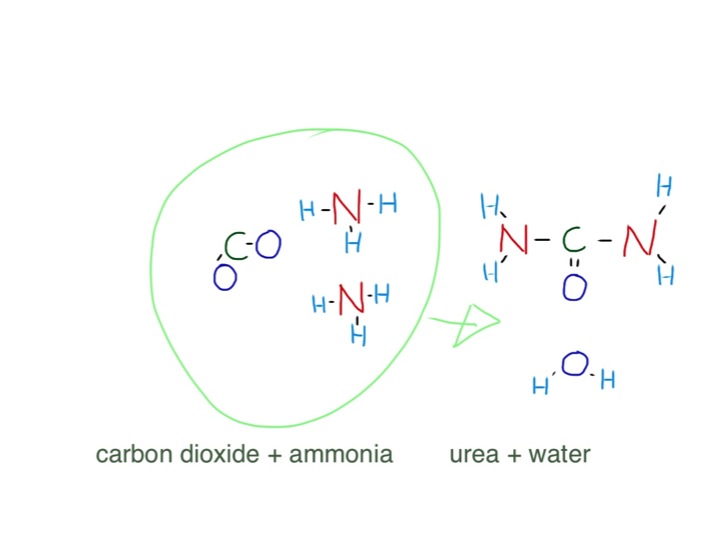 two molecules of ammonia combine with one of carbon dioxide to make urea and water – its not as simple as that – but that is what the urea cycle does