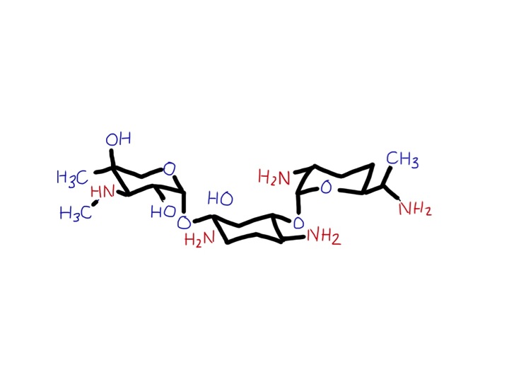 gentamicin is a relatively small molecule with three sugar groups and lots of amine groups (in red) - an aminoglycoside