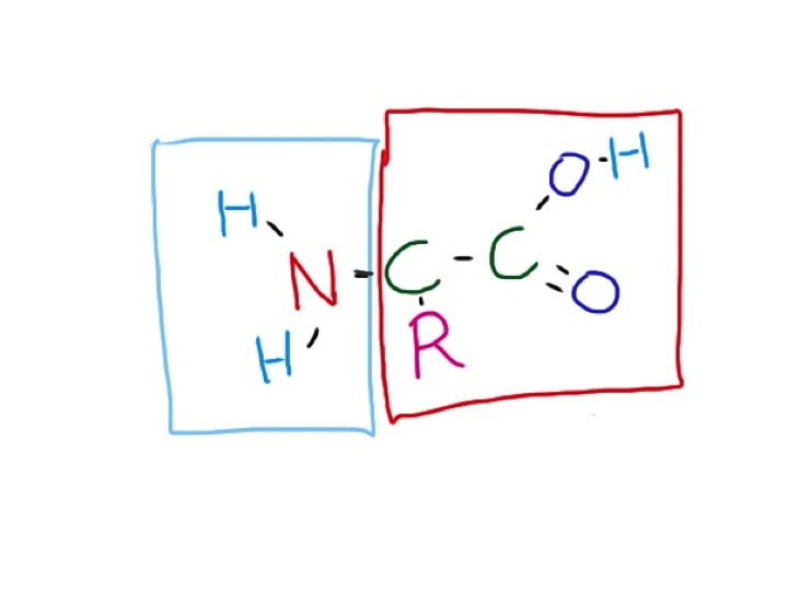 general formula for amino acid - the red box stuff can usually be turned into carbon dioxide and water - the blue box stuff is harder to get rid of
