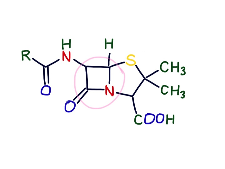 the basic penicillin molecule – the central beta lactam is in the pink circle